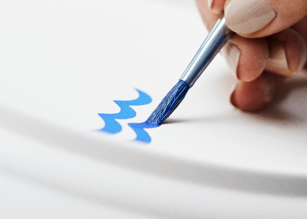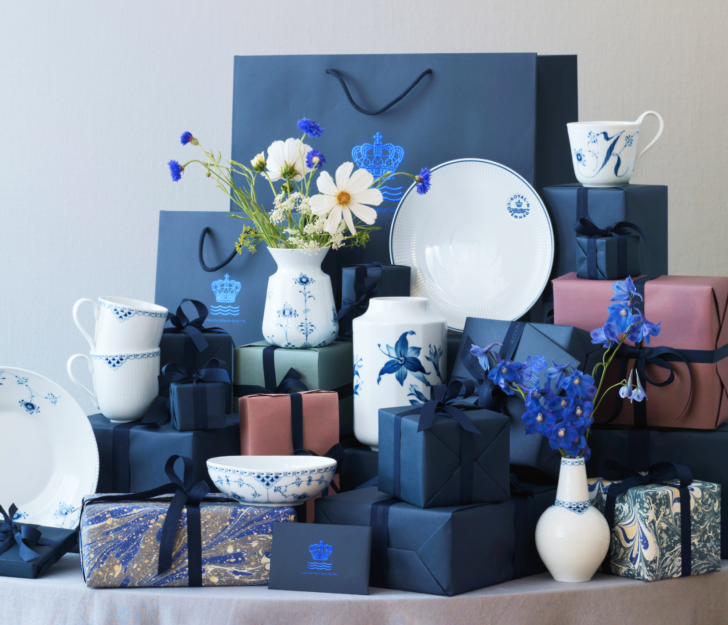 Синий цвет используется во многих изделиях Royal Copenhagen. Роспись фарфора - долгий и сложный процесс, который требует огромной точности и концентрации. Художник, использующий синий цвет, обучается своему ремеслу 4 года. Тонкий узор можно сравнить с личной подписью художника; на первый взгляд изделия могут показаться одинаковыми, но каждый мастер сразу же отличит свою работу и распознает творчество своих коллег. Кроме того, все художники ставят свою подпись на обратной стороне каждого расписанного изделия из фарфора. Линии личной подписи мастера сливаются в единый рисунок с тремя волнами Royal Copenhagen, которые символизируют три датских пролива: Орезунд, Большой Бельт и Малый Бельт.