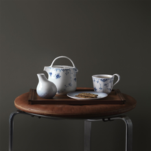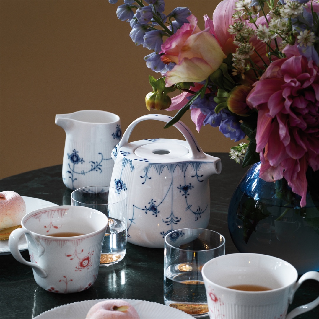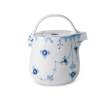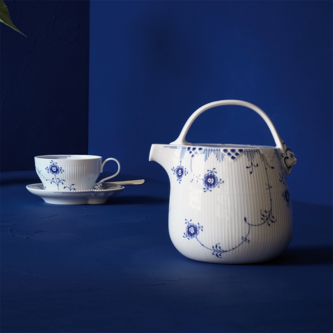 Откройте для себя заварочный чайник Blue Elements объемом 950 мл – полюбившийся ценителями предмет благодаря своей очаровательной форме и игривым синим узорам. Изящные, выполненные вручную рифления и декор в виде рыбьей чешуи украшают корпус чайника, а нарисованный от руки узор изящно обвивает фарфор, представляя собой игривую интерпретацию традиционных мотивов Royal Copenhagen.