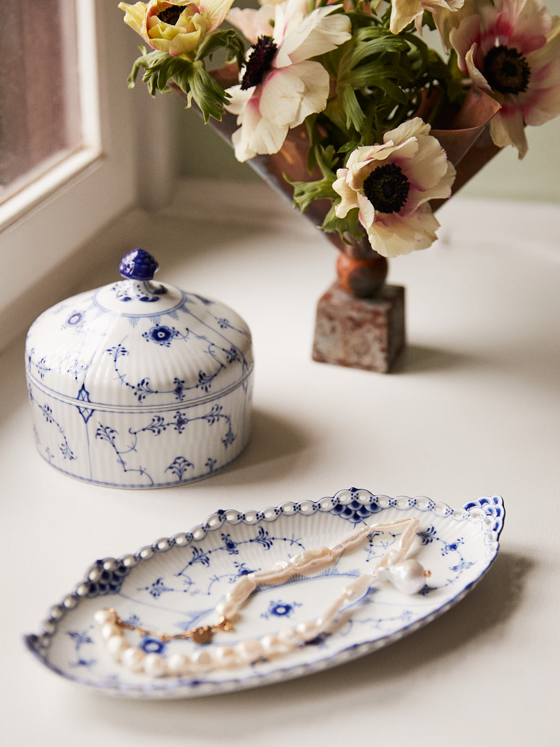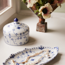 Столовый сервиз из старейшей «рифленой» серии королевского фарфора. Одна из самых первых коллекций мануфактуры, созданная в 1775 году, и спустя 110 лет модернизированная художественным руководителем Арнольдом Крогом. Принципиальные отличия коллекции Blue Fluted Full Lace: