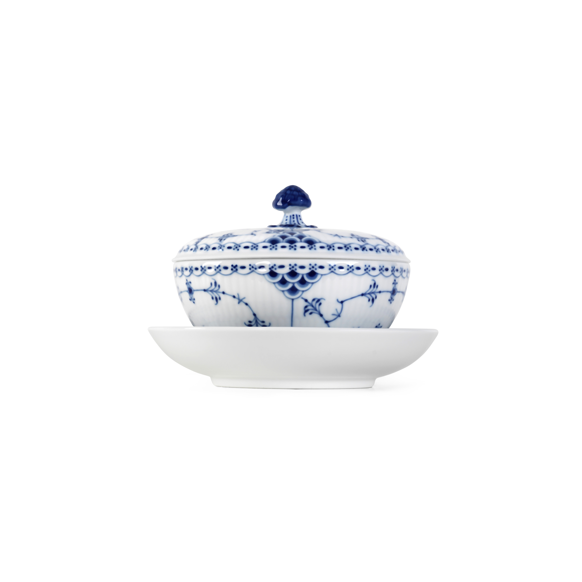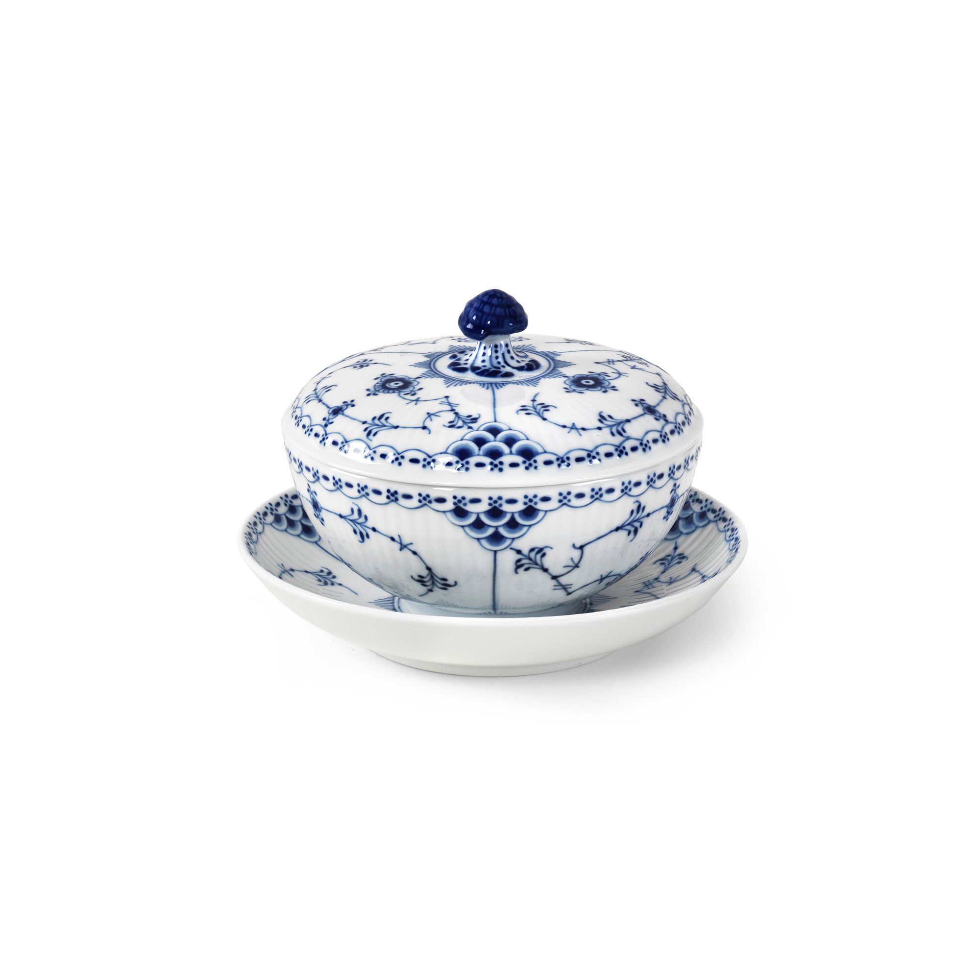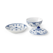 Миска с крышкой и блюдцем Blue Fluted Half Lace является наглядным примером того, как художники Royal Copenhagen используют историческое наследие фабрики в качестве ориентира для создания новых прекрасных изделий. Дополненная крышкой и классическим декором 1888 года, эта миска идеально подходит для индивидуальных порций супа или в качестве шкатулки.