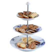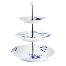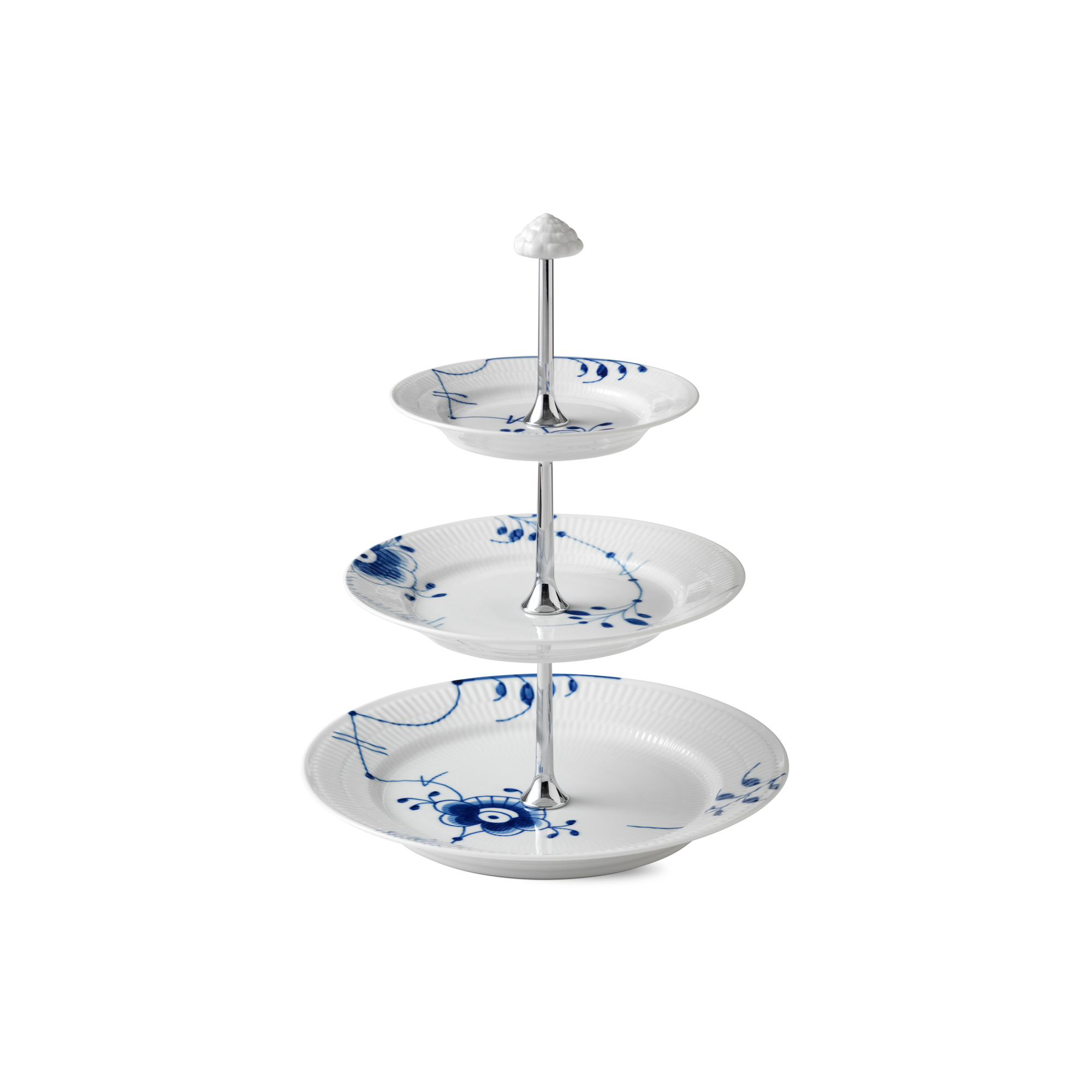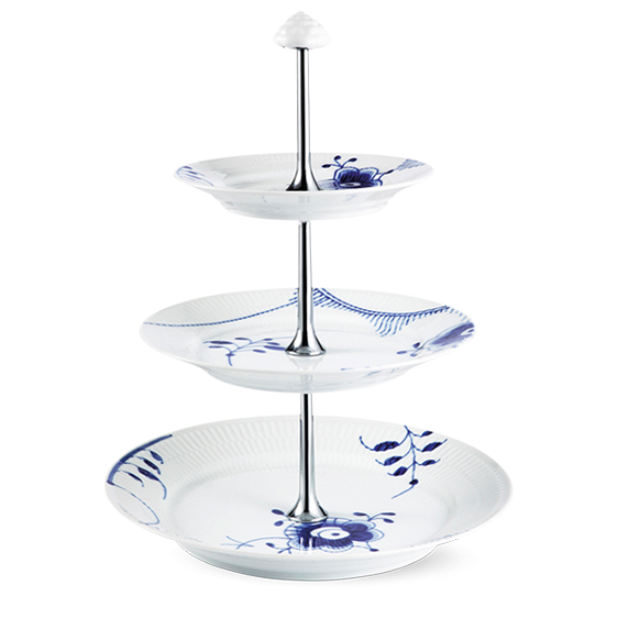 Каждая тарелка этажерки расписана вручную увеличенными элементами классического узора Blue Fluted Plain, количество и размер деталей которого увеличивается с увеличением каждого каждой тарелки.