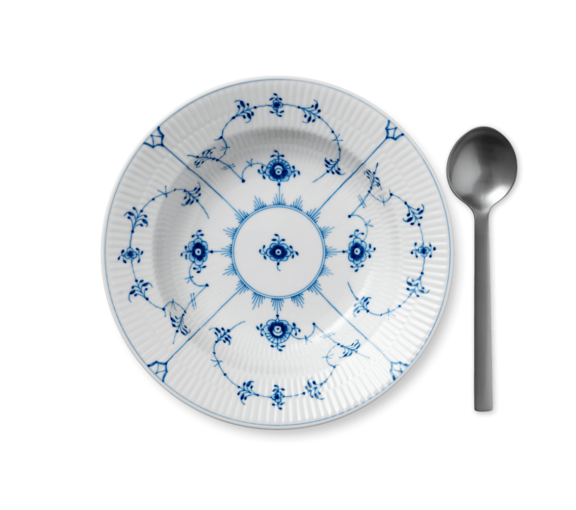Blue Fluted Plain – белоснежный фарфор с легендарным «Узором №1», нанесенным техникой подглазурной росписи. Выполнен в классическом стиле, но отражает основные принципы модернизма, зарождавшегося в конце 18 века.