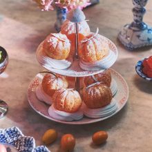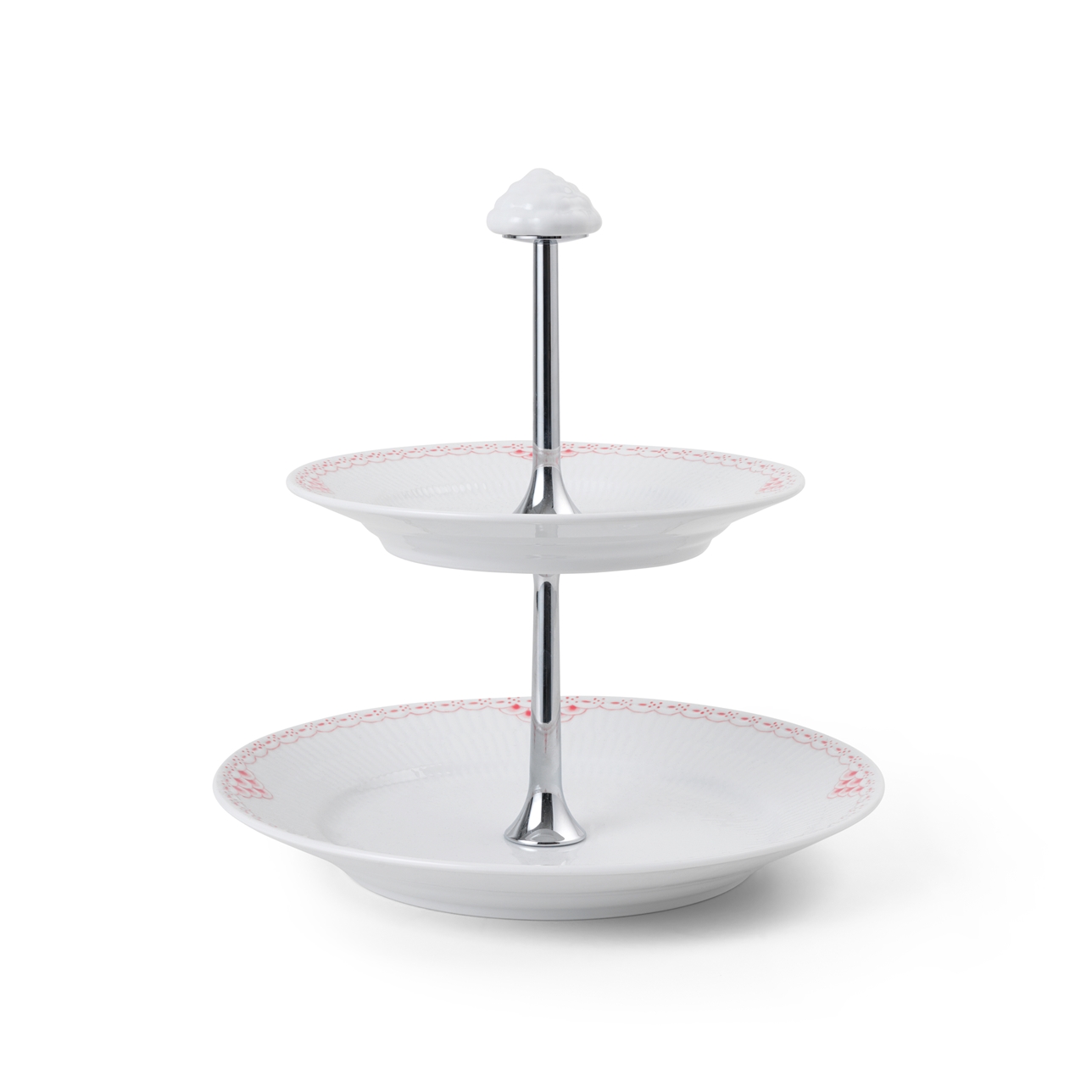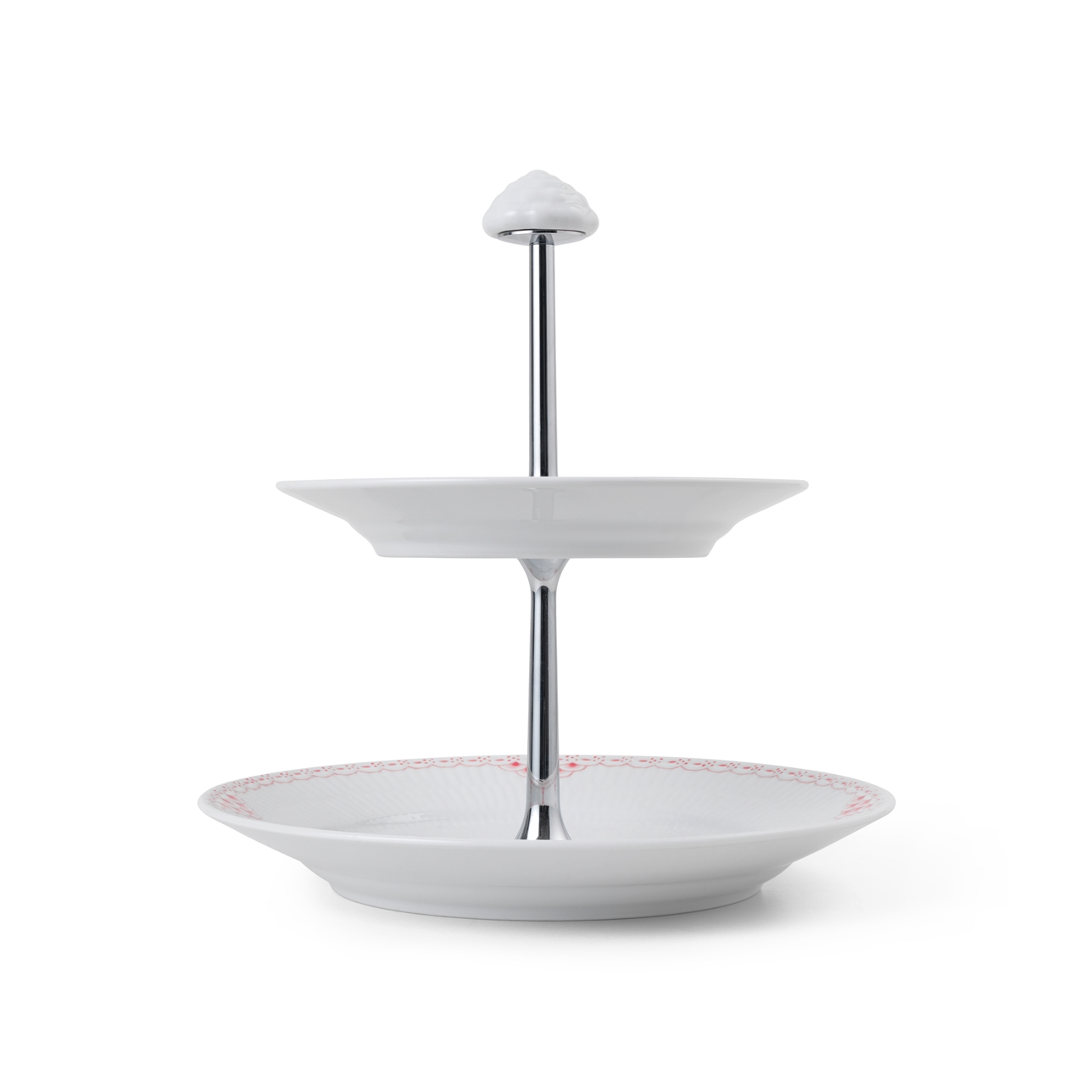 Элегантный способ подачи фруктов, закусок, сыра, шоколада или печенья - двухуровневая этажерка с росписью кораллового цвета и рифленой поверхностью тарелок, несомненно, станет центром внимания любого праздничного стола.