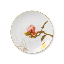 Великолепный цветок магнолии расцветает во всей красе в трех вариациях на этой тарелке Flora формы купе. Тарелка диаметром 22 см с изящными золотыми деталями идеально подходит в качестве обеденной или небольшой ужин тарелки.