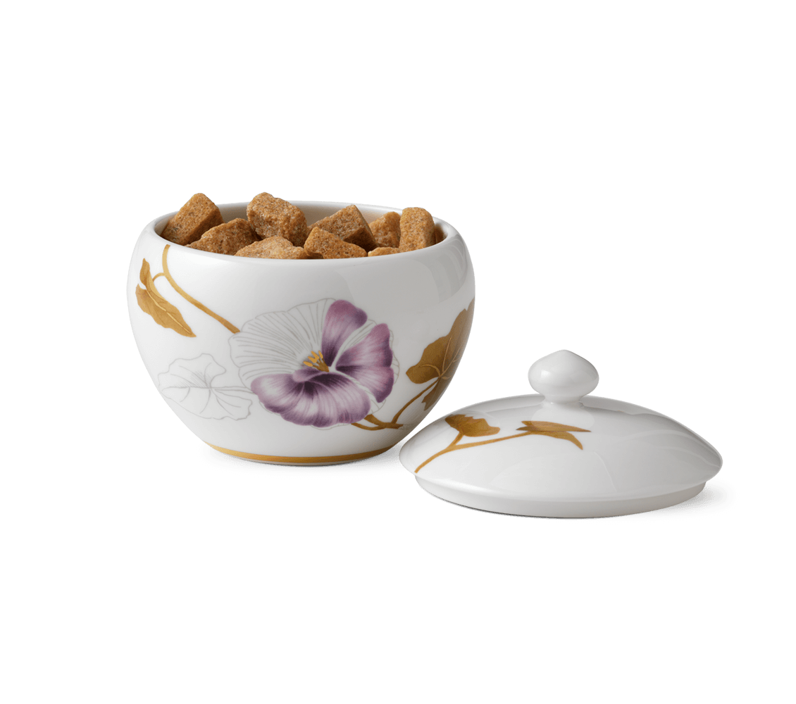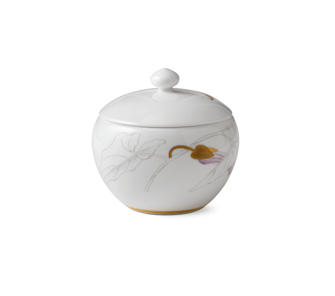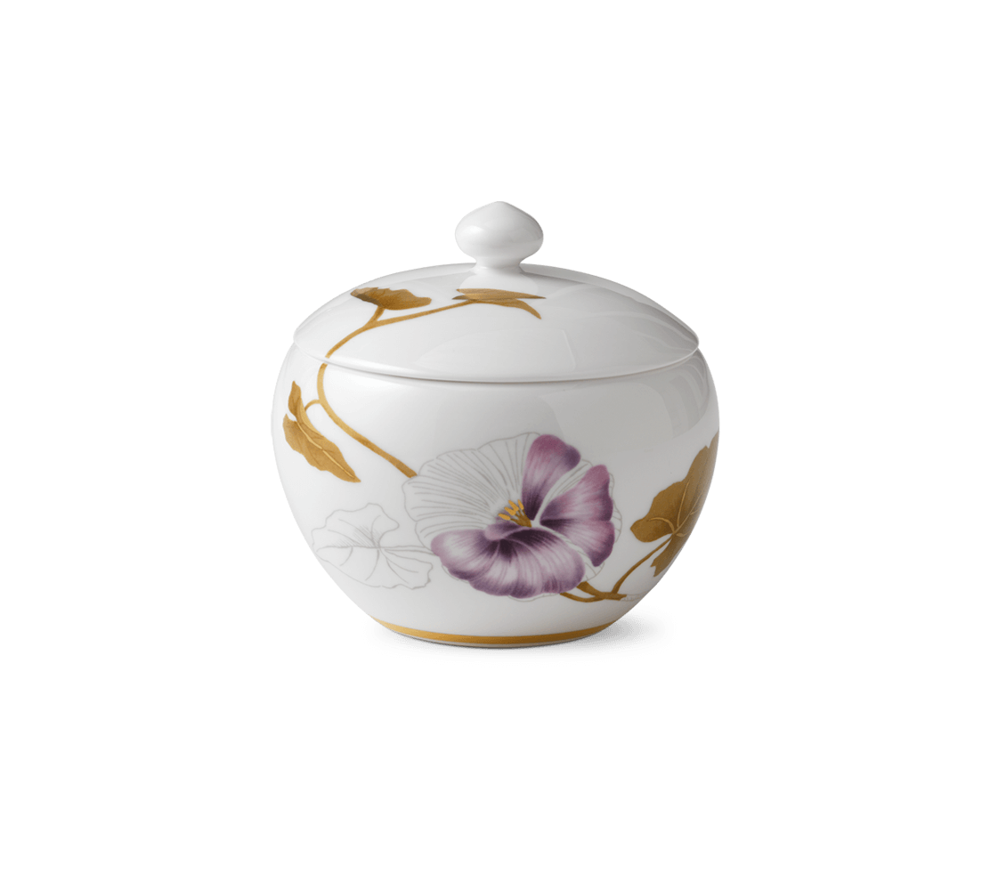 В основу декора легли яркие растительные сюжеты, центральным элементом которых является крупный цветок – лилия, фиалка, василек, орхидея и другие. Коллекция содержит все необходимое для сервировки обеденного или праздничного стола: чайные пары, мелкие и глубокие тарелки, миски, чайники, блюда разного размера и формы, другие элементы. Поверхность фарфоровых предметов ровная без рельефов. Изделия сделаны из костяного фарфора, что придает им легкость, слегка кремовый оттенок и прозрачность.