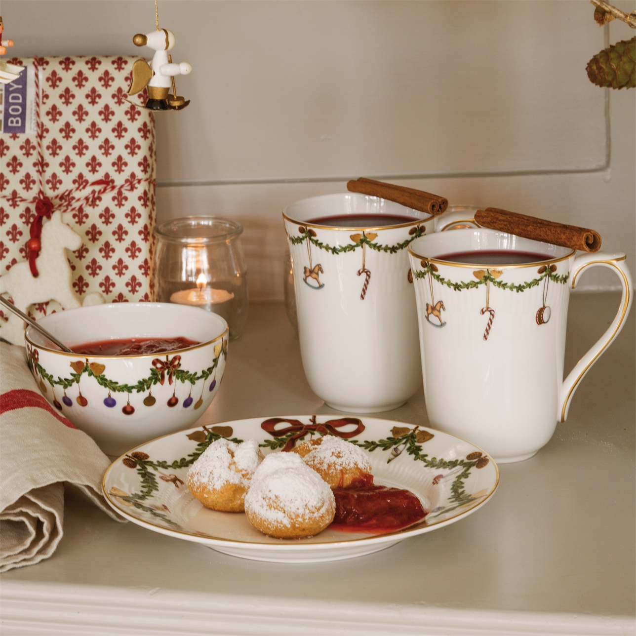 Набор Star Fluted Christmas от Royal Copenhagen — это элегантный и самодостаточный подарок, который принесет праздничное настроение в любой дом. В комплект входят две чашки, выполненные из тончайшего костяного фарфора. Они украшены традиционными еловыми гирляндами, рождественскими игрушками и изысканными золотыми деталями. Этот узор навевает тёплые воспоминания о датских рождественских традициях. Благодаря объему 360 мл чашки идеально подойдут для чаепития или кофе-брейка.