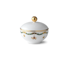 Эта сахарница украшена радостными и детализированными элементами, воплощающими дух праздника. Ее дизайн включает в себя изящный венок из еловых веток и классические новогодние игрушки, а крышка дополнена элегантными золотыми деталями, придающими особую роскошь.