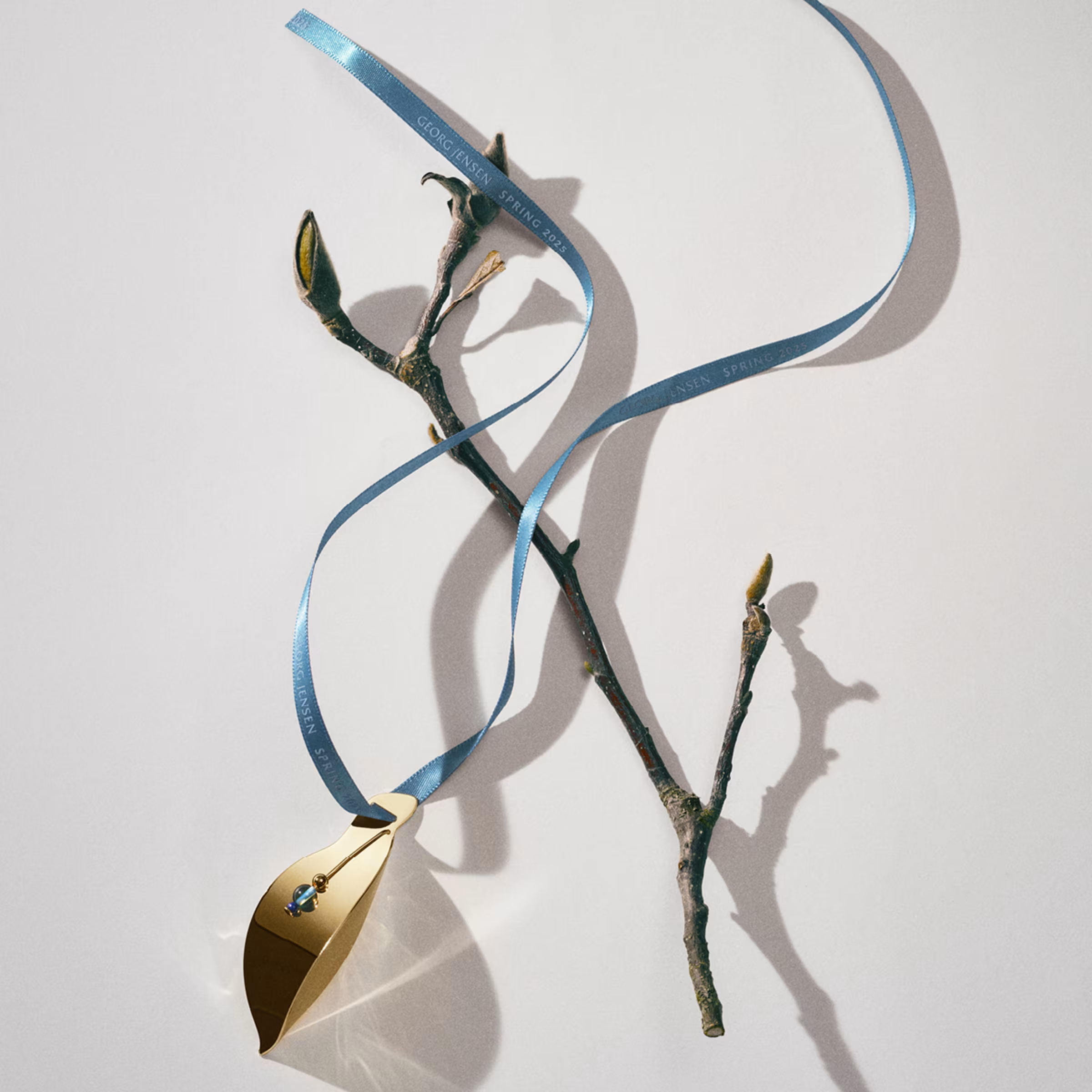 Весеннее украшение, покрытое 18-каратным золотом, подвешено на изящной атласной ленте и дополнено маленьким шармом-бусиной.